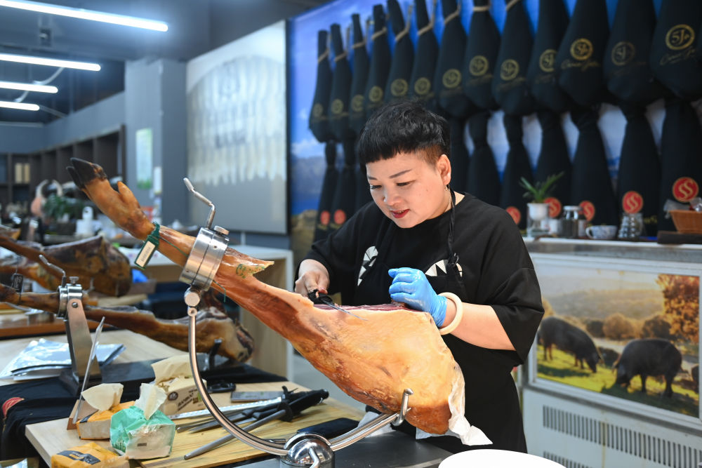 ↑一名西班牙进口商品店主在义乌国际商贸城五区片切西班牙伊比利亚火腿
