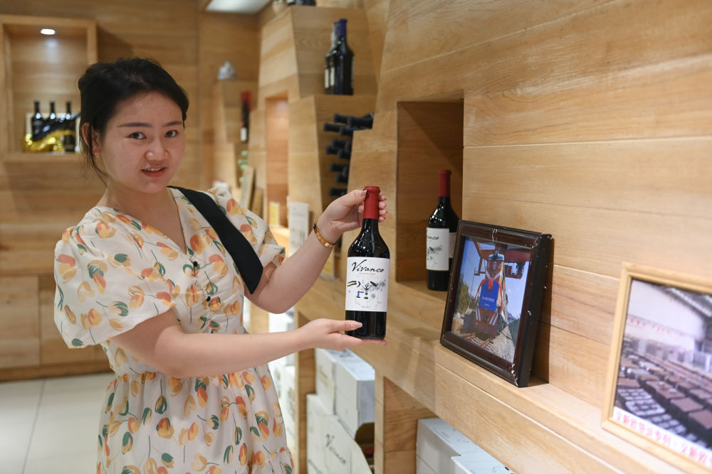 ↑义乌国际商贸城店员展示通过“义新欧”中欧班列进口的西班牙红酒