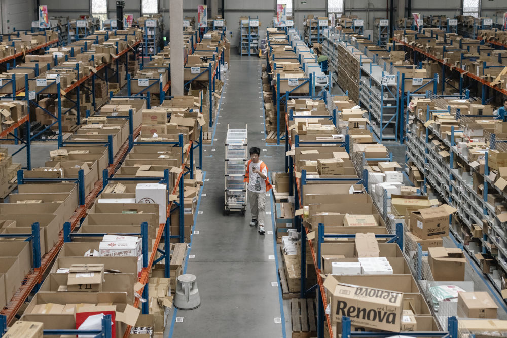 ↑工作人员在西班牙马德里菜鸟海外仓库分拣商品