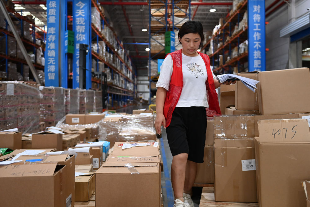 ↑工作人员在义乌保税区菜鸟海外仓工作