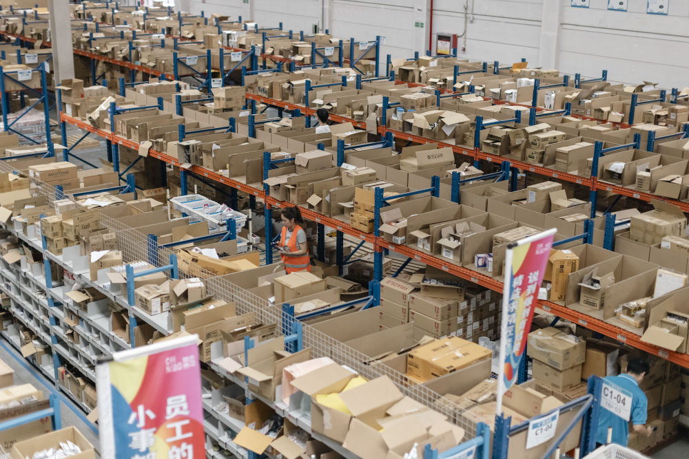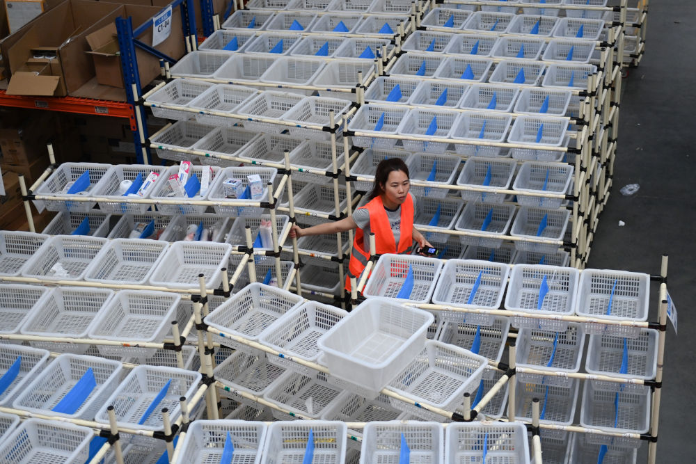 ↑工作人员在义乌保税区菜鸟海外仓库分拣商品