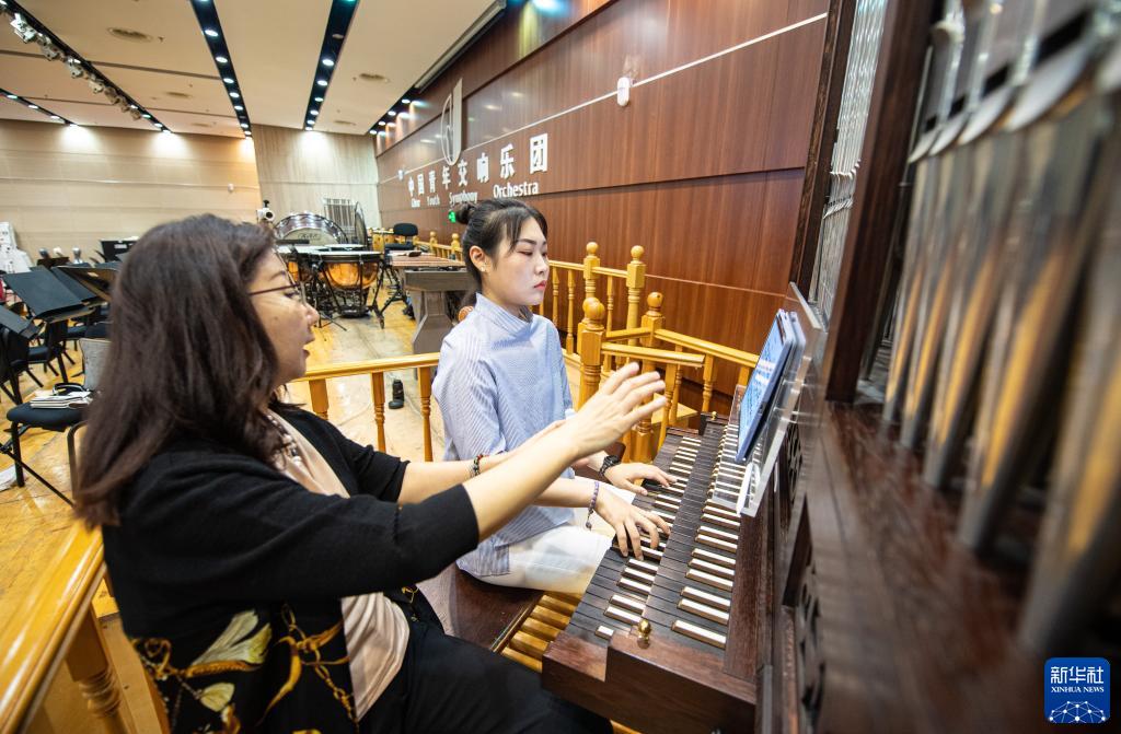 9月14日,在位于北京的中央音乐学院,沈凡秀教授(左)指导管风琴专业学生练习莫扎特的《F小调幻想曲 K.608》。