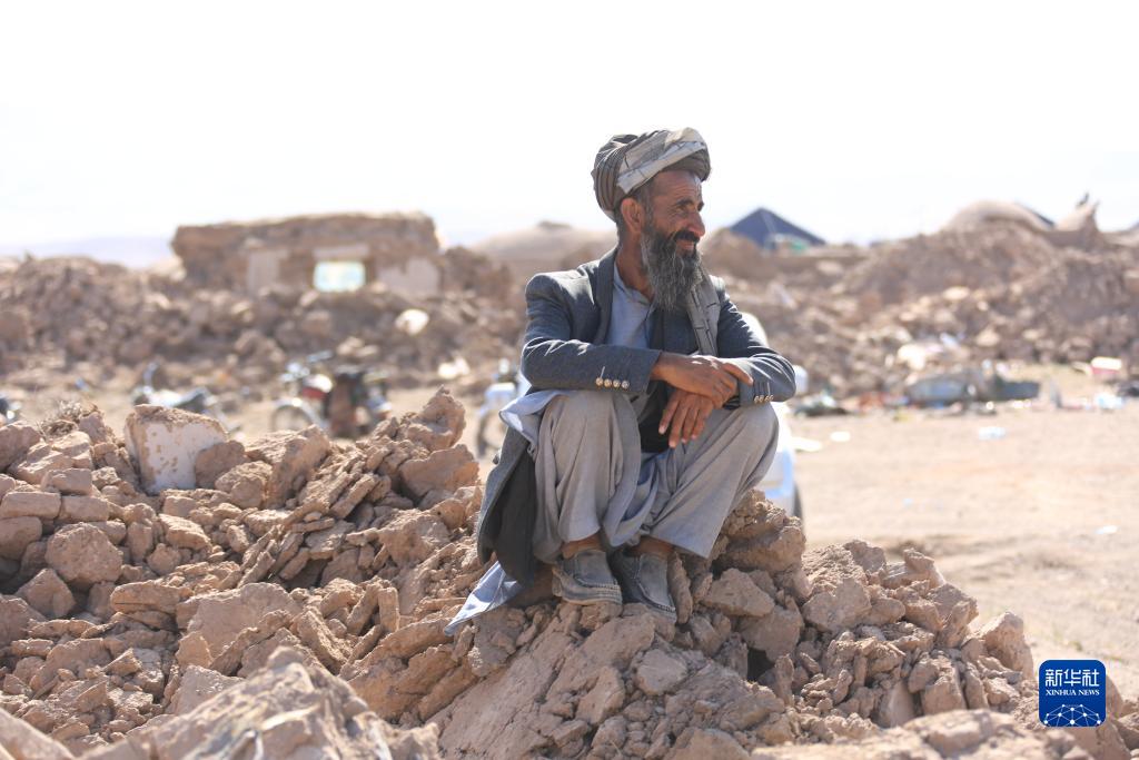 10月11日,在阿富汗西部赫拉特省津达詹区奈卜拉菲村,一名老人坐在震后废墟上。