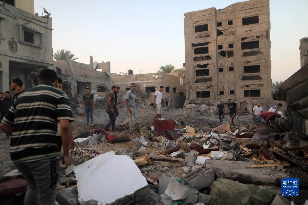 10月12日,在加沙地带南部城市汗尤尼斯,人们查看遭以色列空袭后的建筑。
