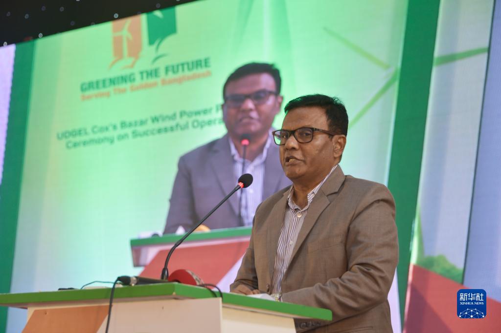 10月12日,在孟加拉国达卡,孟加拉国电力、能源和矿产资源部高级常秘拉赫曼在科克斯巴扎尔风电项目投产仪式上讲话。