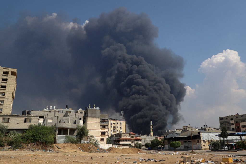 10月11日,加沙城的建筑遭以色列空袭后升起浓烟。新华社发(里泽克·阿卜杜勒贾瓦德摄)