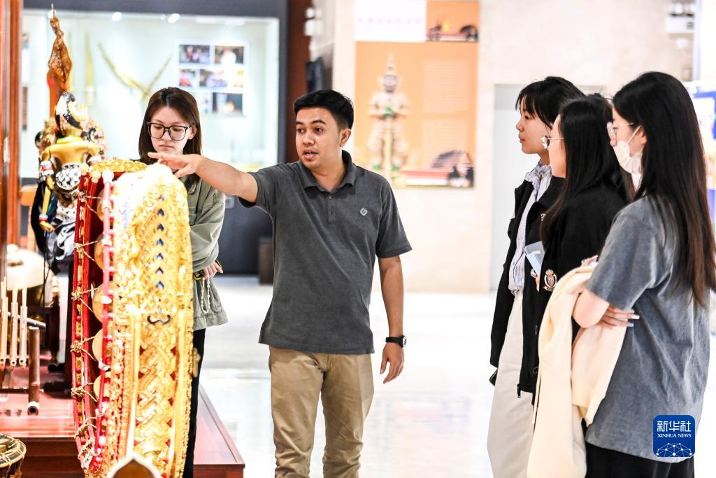 10月12日,在广西艺术学院,仁迪(左二)为学生讲解甘美兰知识。