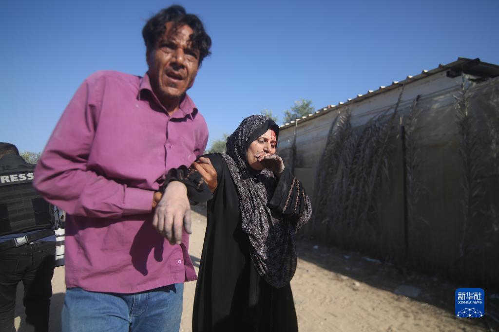 10月13日,在加沙地带南部城市拉法,人们在遭以色列空袭的受损建筑中救援伤者。