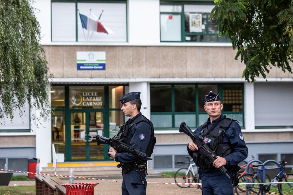 10月13日,在法国北部城市阿拉斯,警察在发生袭击事件的甘贝塔高中外警戒。
