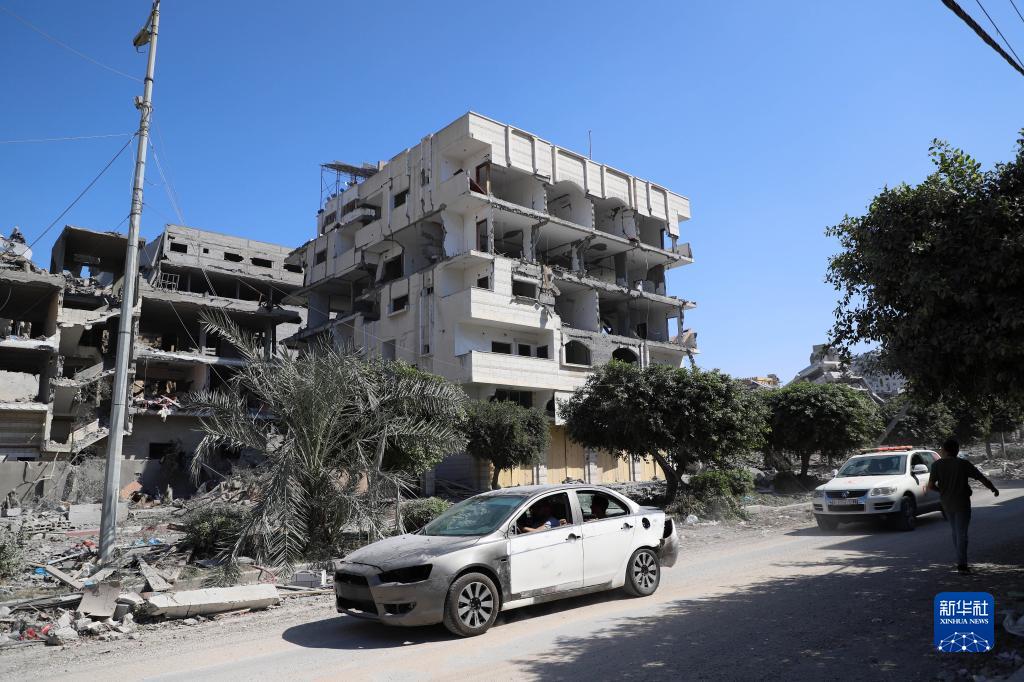 10月13日,在加沙城,人们驾车经过遭以色列空袭损毁的建筑。