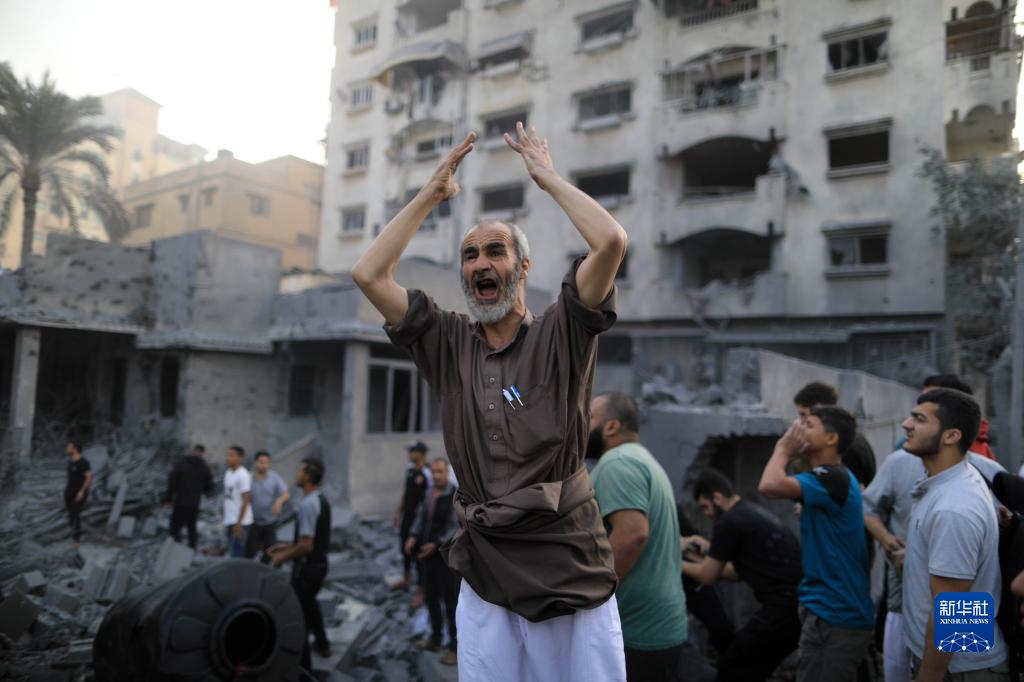 10月14日,在加沙地带南部城市汗尤尼斯,人们在遭以色列空袭炸毁的建筑中救援。