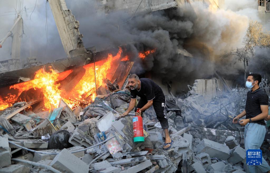 10月14日,在加沙地带南部城市汗尤尼斯,一名男子在扑灭以色列空袭造成的火灾。