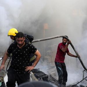 10月14日,在加沙地带南部城市汗尤尼斯,人们在扑灭以色列空袭造成的火灾。新华社发(亚西尔·库迪摄)