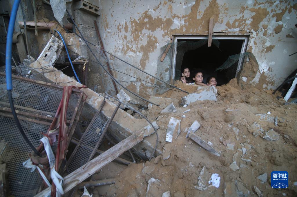 10月15日,在加沙地带南部城市拉法,儿童在遭以色列空袭后的受损建筑中向外张望。