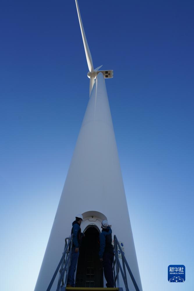 6月12日,在阿根廷丘布特省马德林港的罗马布兰卡一期风电场,风机运维人员检查设备运行状况。