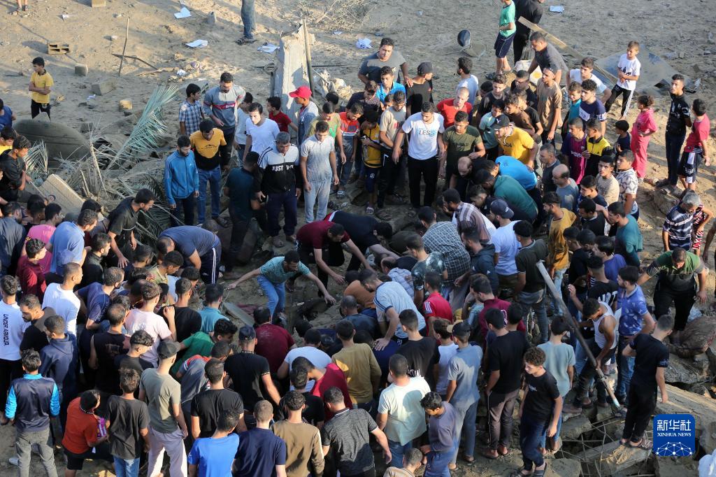 10月16日,在加沙地带南部城市汗尤尼斯,人们在遭以色列袭击后的建筑废墟中救援伤者。