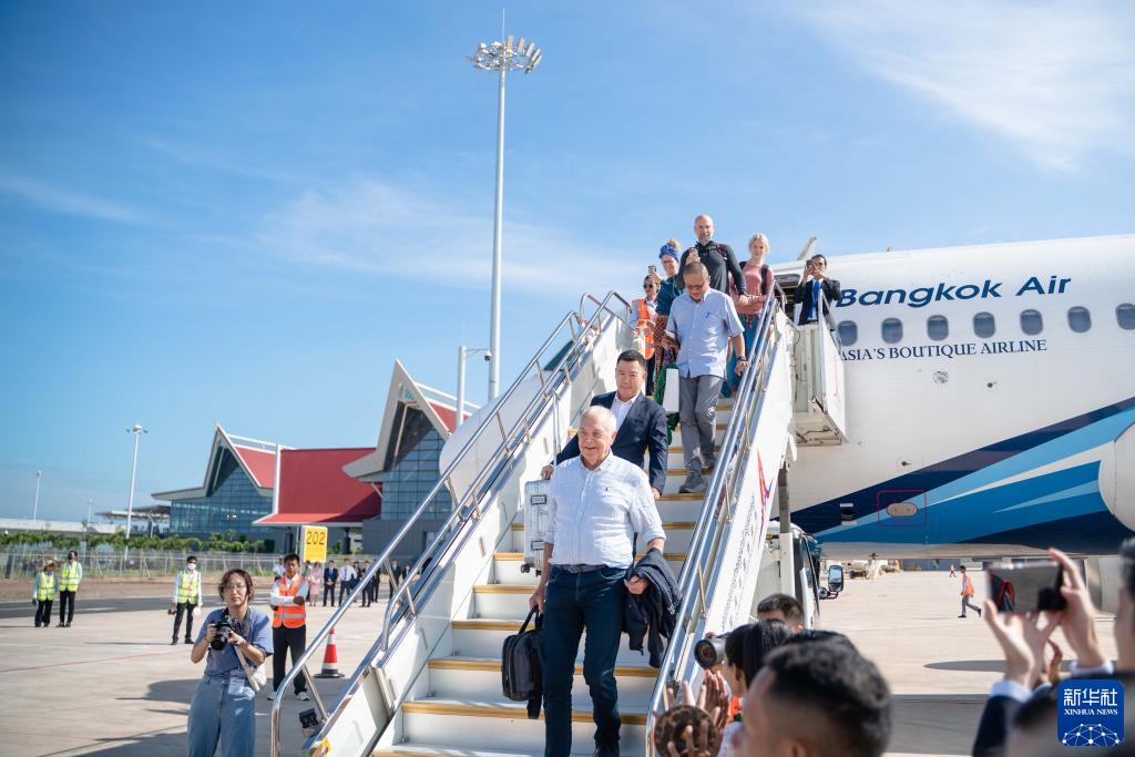 10月16日,在柬埔寨暹粒吴哥国际机场,首架进港客机乘客走下飞机。新华社发