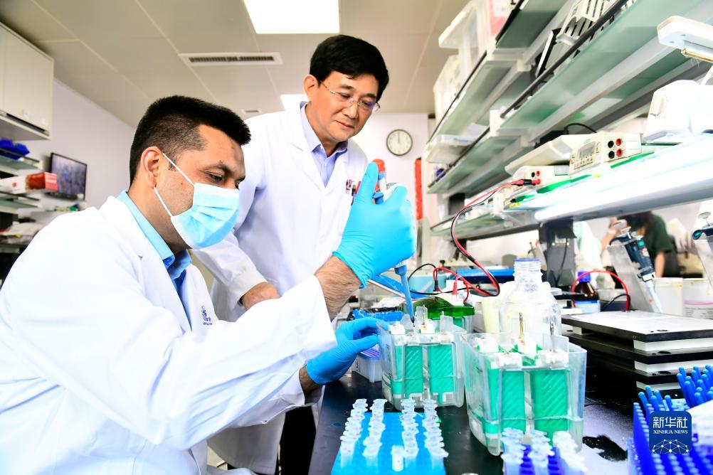 10月16日,在山东大学齐鲁医学院肿瘤研究联合实验室,默罕默德·沙巴兹(左)在做实验。