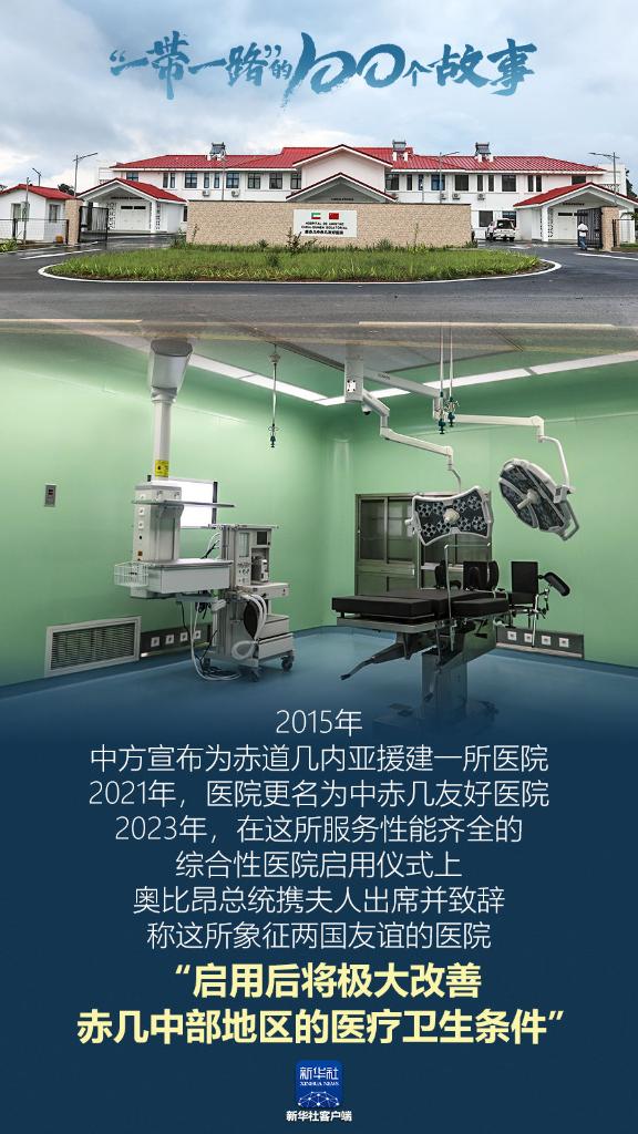 2015年,中方宣布为赤道几内亚援建一所医院。2021年,医院更名为中赤几友好医院。2023年,在这所服务性能齐全的综合性医院启用仪式上,奥比昂总统携夫人出席并致辞,称这所象征两国友谊的医院“启用后将极大改善赤几中部地区的医疗卫生条件”。