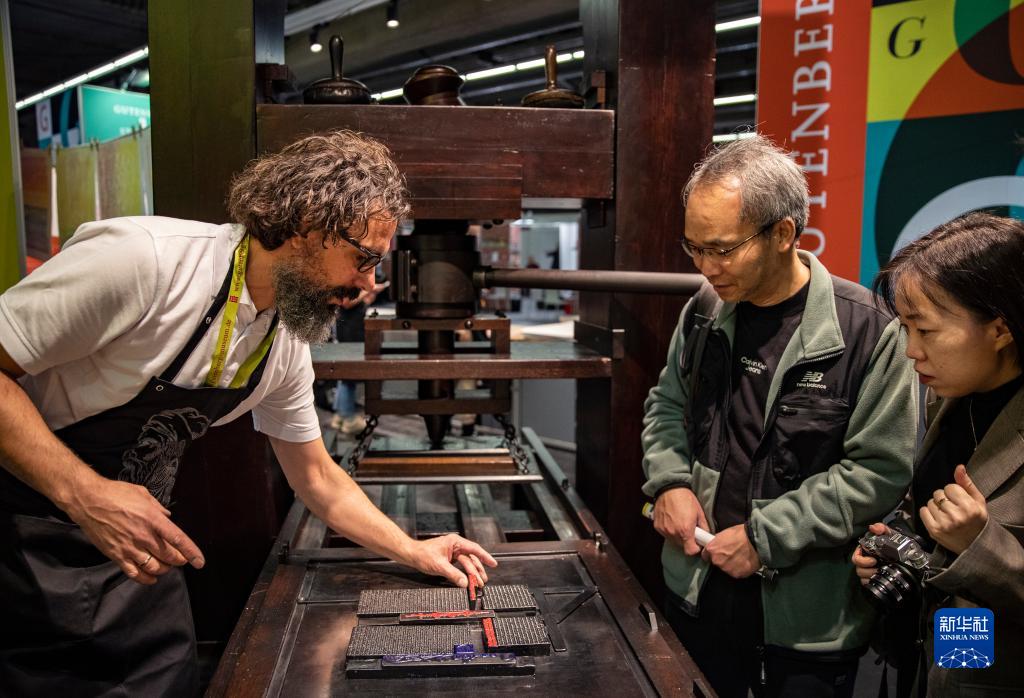 10月18日,一名匠人在德国法兰克福书展上展示德国传统印刷技艺。