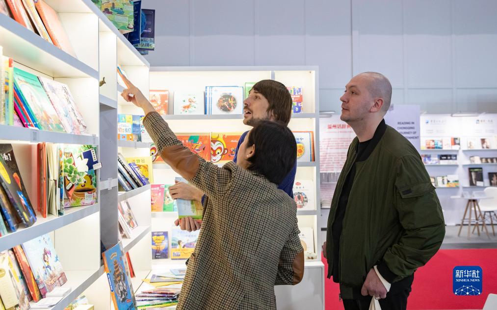 10月18日,在德国法兰克福书展中国展区,参展商向参观者介绍中国图书。