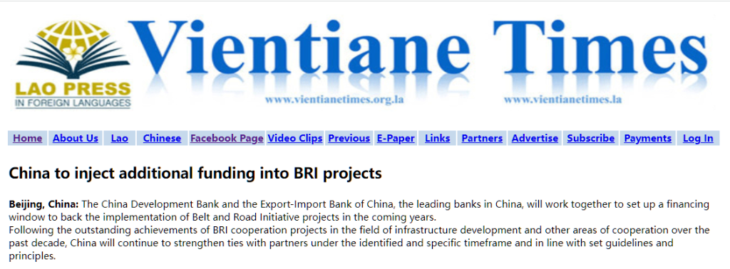 老挝《万象时报》19日刊发文章《中国将持续加大对“一带一路”项目支持》。(网站截图)