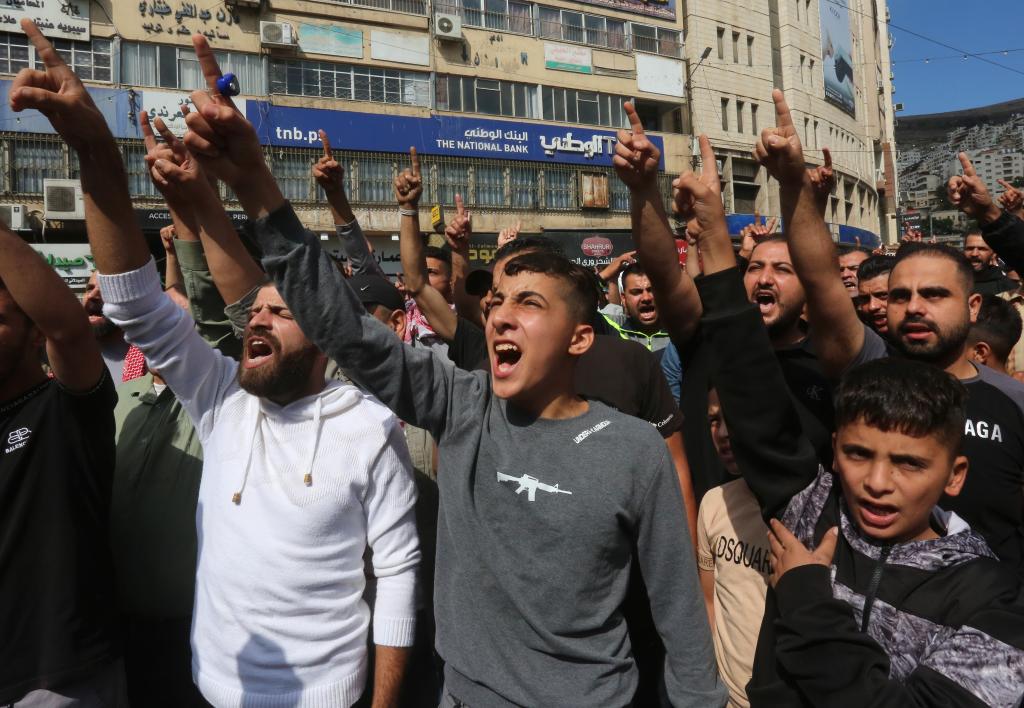 10月18日,在约旦河西岸城市纳布卢斯,民众上街游行抗议加沙医院遭袭。 新华社发(尼达尔·艾仕塔耶摄)