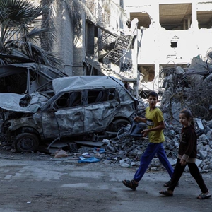 10月20日,在加沙地带南部城市汗尤尼斯,儿童走过遭以色列袭击损毁的建筑。