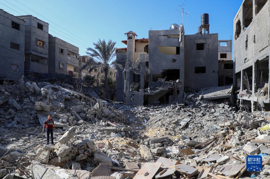 10月20日,在加沙地带南部城市汗尤尼斯,男孩站在遭以色列袭击损毁的建筑中。