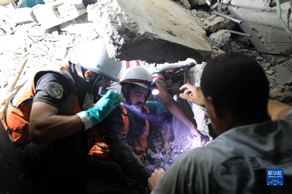 10月22日,在加沙城,人们在遭以色列袭击损毁的建筑中实施救援。
