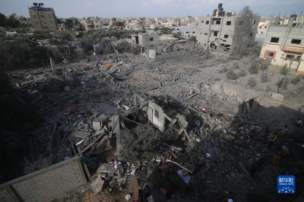 这是10月22日在加沙地带南部城市汗尤尼斯拍摄的建筑废墟。