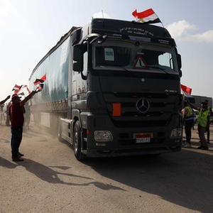 以色列和巴勒斯坦本月7日以来爆发新一轮军事冲突,造成大量人员伤亡。21日,首批20辆装载人道救援物资的卡车从拉法口岸埃及一侧进入加沙地带。