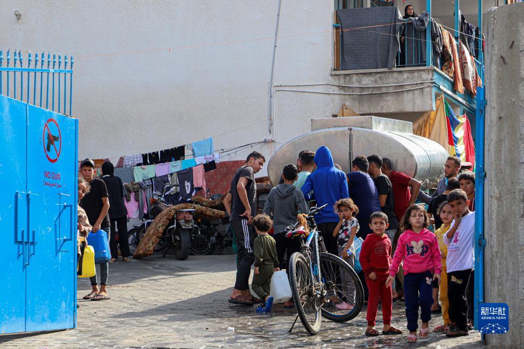10月22日,儿童在加沙地带南部城市汗尤尼斯一所临时收容学校内取水。