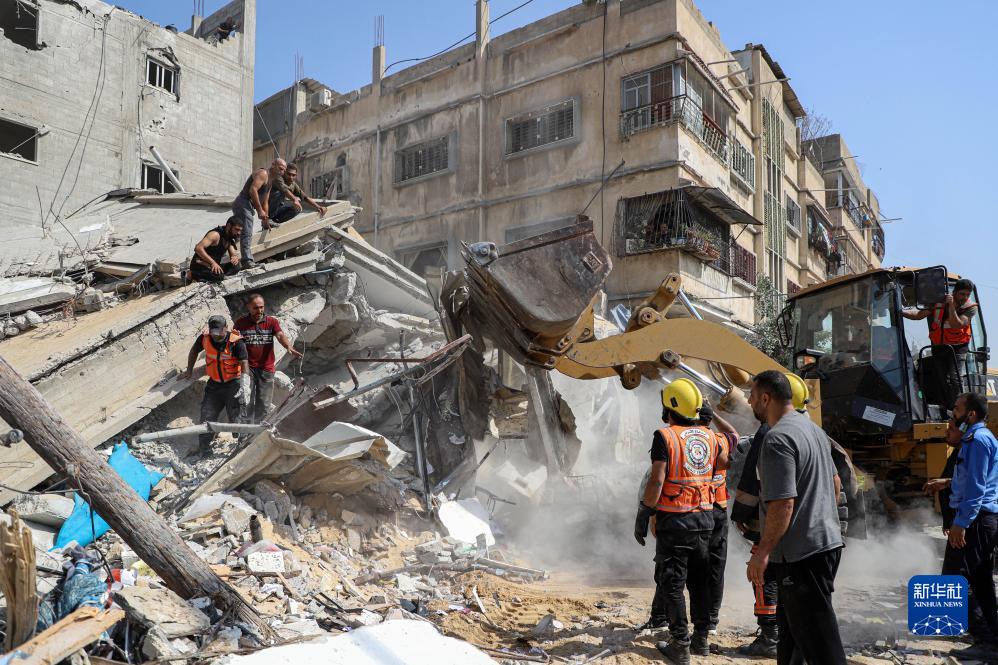 10月24日,在加沙地带南部城市汗尤尼斯,人们在遭以色列袭击的建筑废墟中搜救。