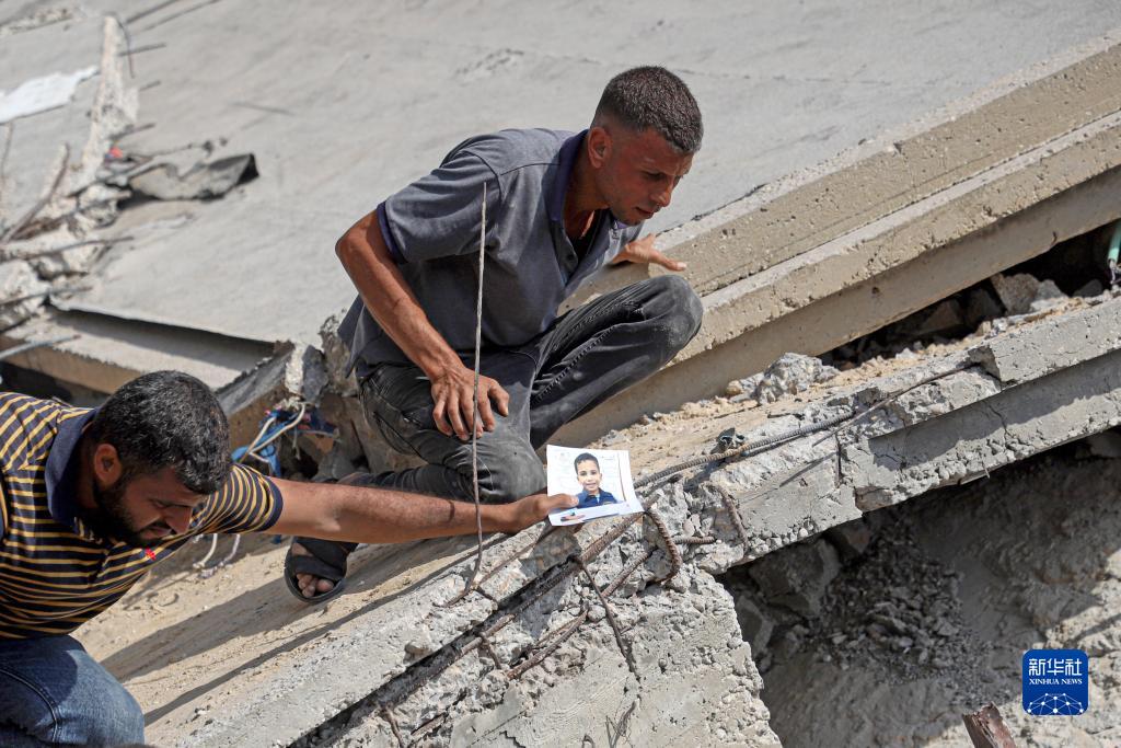 10月24日,在加沙地带南部城市汗尤尼斯,一名男子手持一名儿童的照片在遭以色列袭击的建筑废墟进行搜救。
