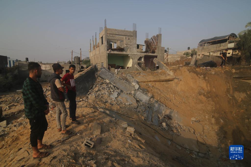 10月24日,在加沙地带南部城市拉法,人们站在遭以色列袭击的建筑废墟旁。