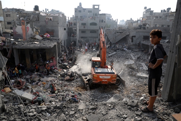 10月25日,在加沙地带南部城市汗尤尼斯,挖掘机在以色列空袭后的建筑废墟现场作业。新华社发(里泽克·阿卜杜勒贾瓦德摄)