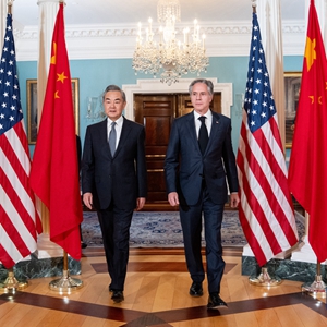 10月26日,中共中央政治局委员、外交部长王毅在应邀访美期间在华盛顿同美国国务卿布林肯举行会谈。新华社发