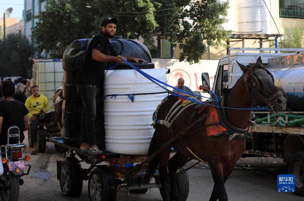 10月30日,因缺乏燃料,人们在加沙地带南部城市汗尤尼斯使用畜力车运输饮用水。