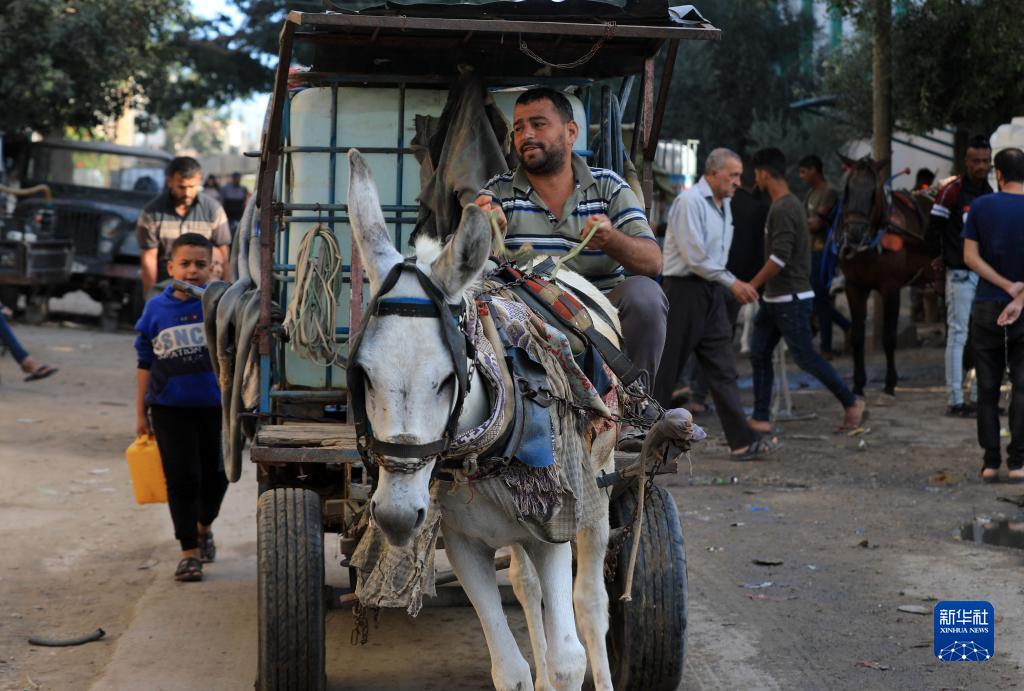 10月30日,因缺乏燃料,人们在加沙地带南部城市汗尤尼斯使用畜力车运输饮用水。