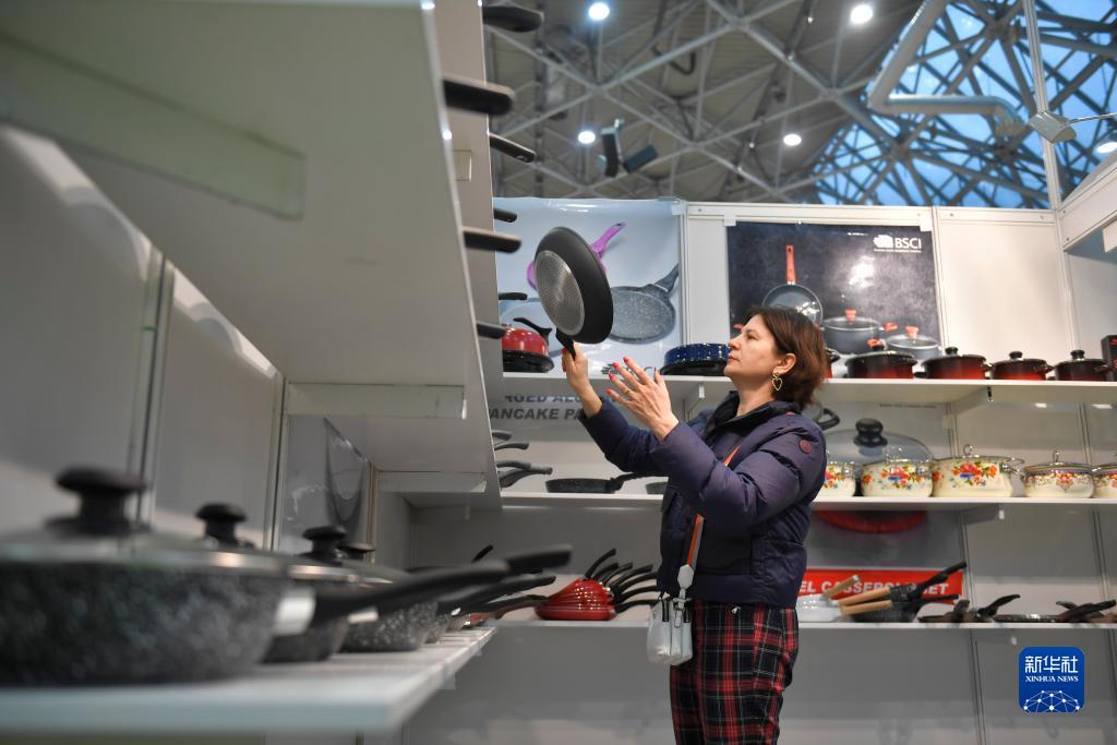 10月30日,在俄罗斯首都莫斯科,一名女子在中国消费品(俄罗斯)品牌展览会上查看展出的锅具。