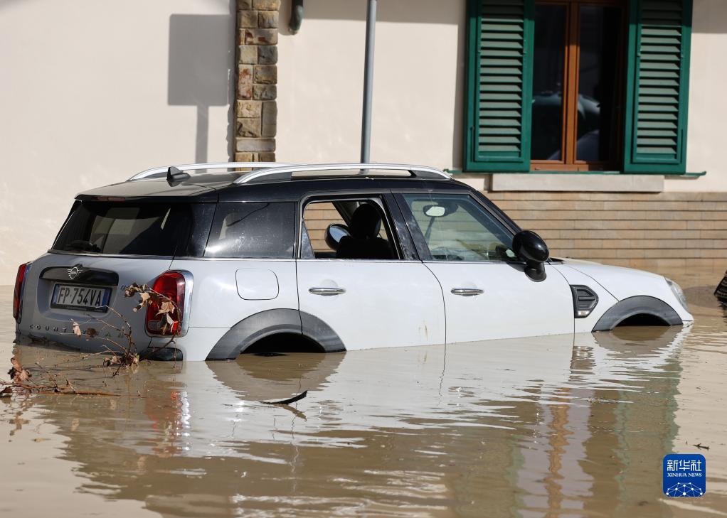 11月3日,在意大利托斯卡纳大区比森齐奥营,一辆汽车浸泡在洪水中。