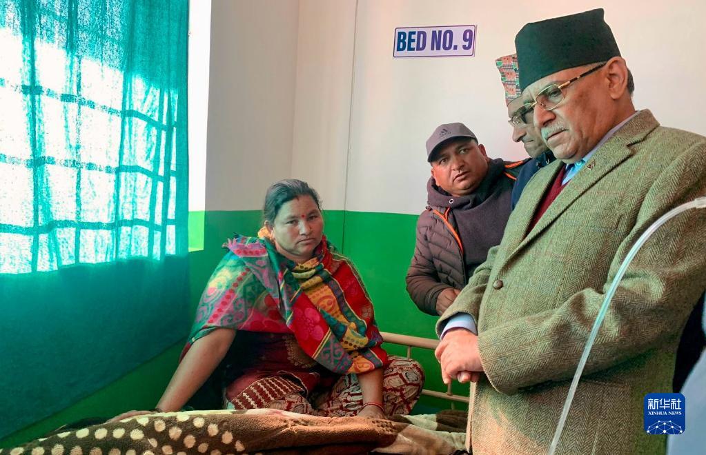 11月4日,在尼泊尔西部扎泽尔果德,尼泊尔总理普拉昌达(右)在医院看望受伤民众。新华社发(尼泊尔总理府供图)