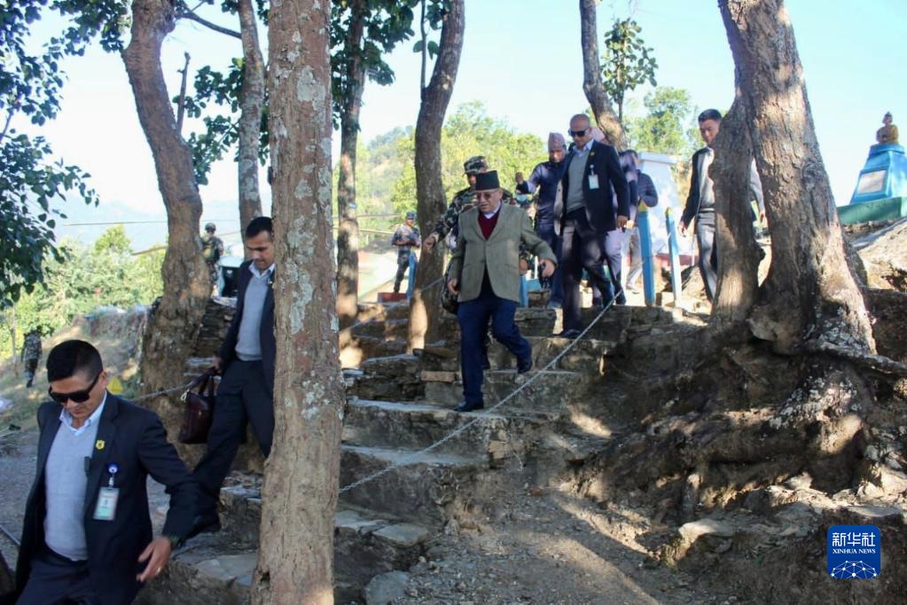 11月4日,在尼泊尔西部扎泽尔果德,尼泊尔总理普拉昌达(中)抵达灾区。新华社发(尼泊尔总理府供图)