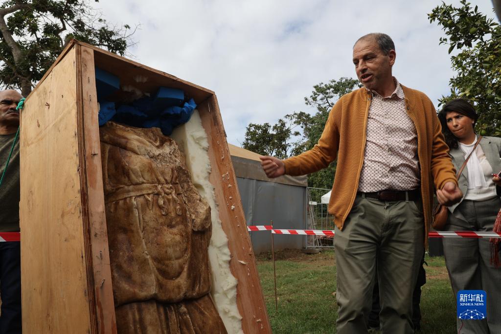 11月3日,在摩洛哥首都拉巴特,考古工作者介绍在古城遗址出土的一尊大理石雕塑。新华社记者 霍晶 摄