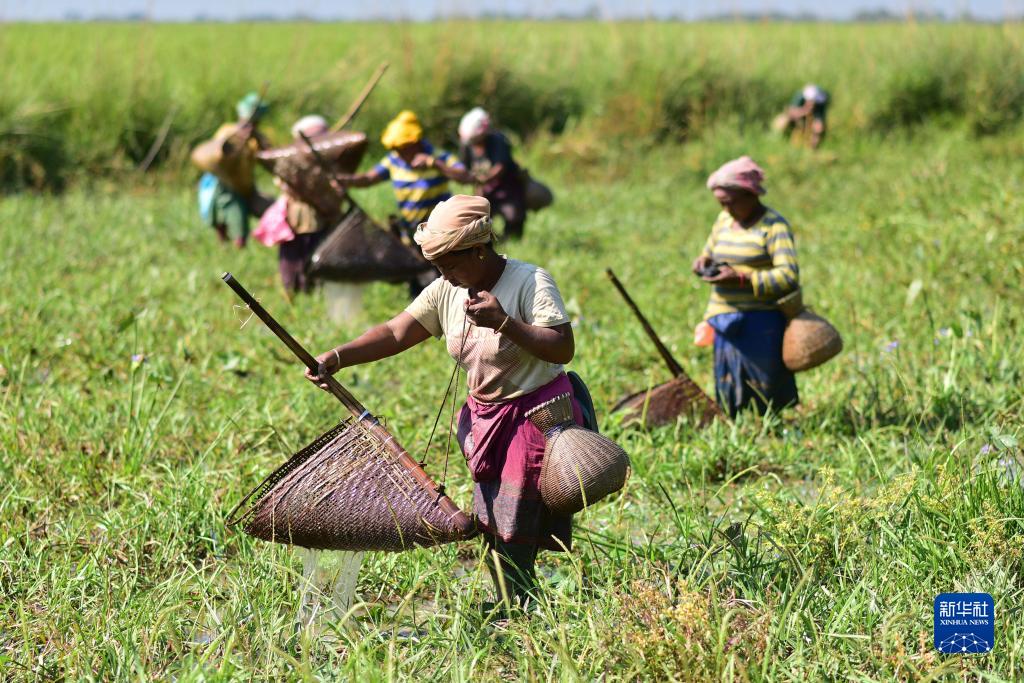10月30日,印度阿萨姆邦纳冈地区的女子在一处湿地捕鱼。