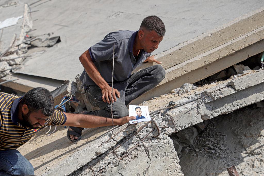 10月24日,在加沙地带南部城市汗尤尼斯,一名男子手持一名儿童的照片在遭以色列袭击的建筑废墟进行搜救。新华社发