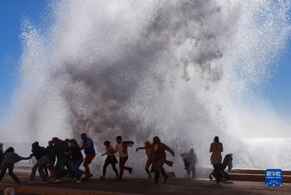 近日,受风暴天气影响,法国尼斯海岸巨浪拍岸,吸引人们驻足观看。