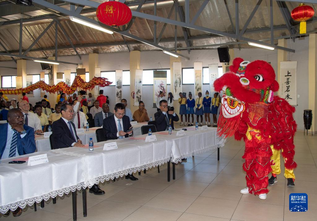 11月6日,学生在纳米比亚温得和克举行的纳米比亚大学孔子学院建院十周年庆典上表演舞龙、舞狮。