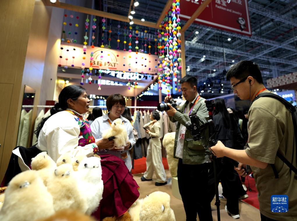 11月7日,在第六届进博会消费品展区“温暖驼”展台,秘鲁手工艺人接受媒体采访。
